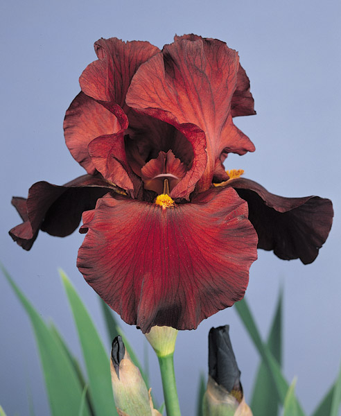 Рассада ириса War Chief- это высокие прочные цветоносы, высотой до 94 см, на которых развиваются до 4 ветвей и более 10 бутонов, что гарантирует обильное пышное цветение. Нижние доли (фолы) и верхние доли (стандарты) имеют одинаковую расцветку и окрашены в красно-рубиновый тон с тонкими полосками более темного цвета, по краю цвет становится более темным и насыщенным. Яркая расцветка смягчается матовой структурой лепестков. Бородка - ярко-желтая, резко выделяющаяся на темном фоне. Цветок гофрированный, с причудливо изогнутыми лепестками. Сроки цветения средние, окраска не выцветает на солнце.