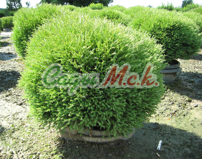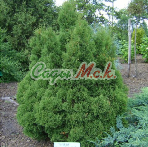 Туя западная Recurva Nana - карликовый кустарник до 2 м высоты и такого же диаметра. Крона шаровидная. Ветви прямые и восходящие. Веточки скрученные. Хвоя чешуйчатая, густая, матово зеленая, зимой буровато-зеленая.
